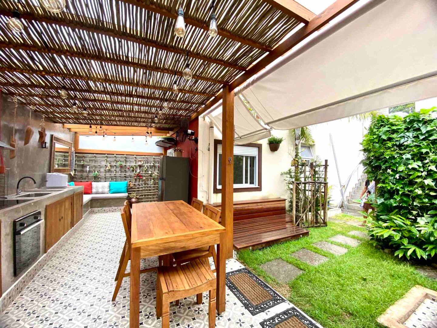 Com uma localização privilegiada e muito silenciosa, a casa está disponível no Airbnb e é muito arejada, com bastante luz natural, confortável e integrada com a natureza. Dá até aproveitar o inverno, pois tem uma lareira ampla e jardins de inverno.
