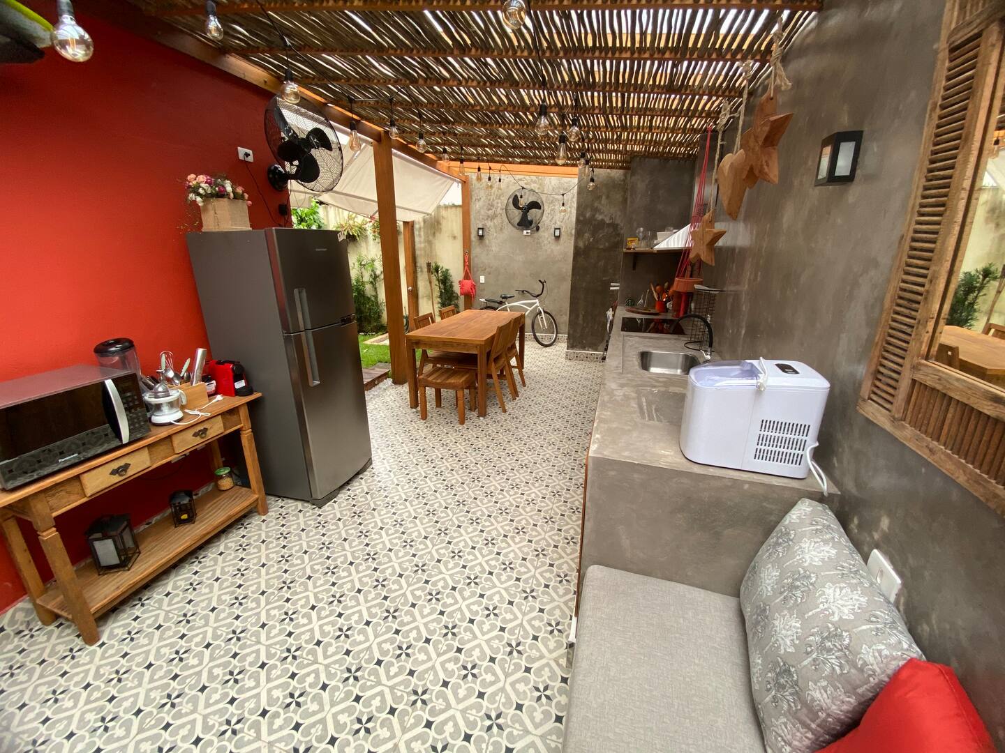 Apartamento com decoração praiana, rústica e charmosa, clima íntimo, descontraído e aconchegante. Esse studio acomoda até 4 pessoas, tem cozinha, varanda e ar-condicionado. Fica localizado na montanha, o que dificulta acesso para quem não está com carro, e perto de uma cachoeira com piscina natural. Só 5 minutos da praia do Perequê. O apartamento do Airbnb conta ainda com um lounge com uma pequena piscina, ducha externa, e estacionamento com 1 vaga.